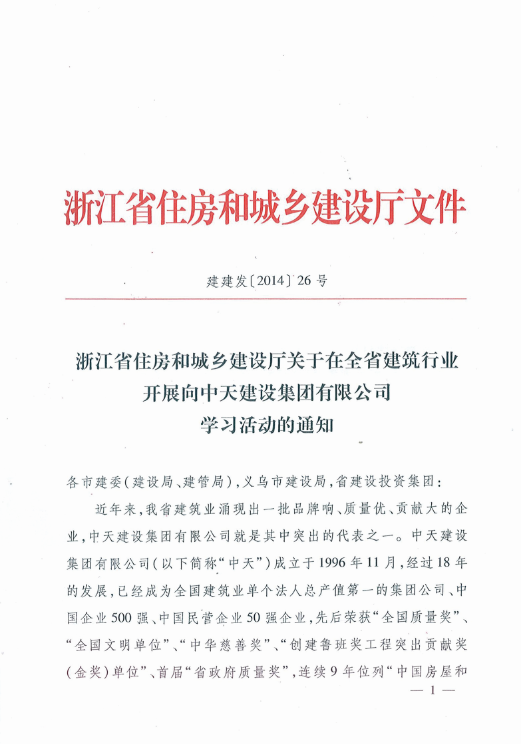 《浙江省住房和城乡建设厅关于在全省建筑行业开展向4001百老汇建设集团有限公司学习活动的通知》